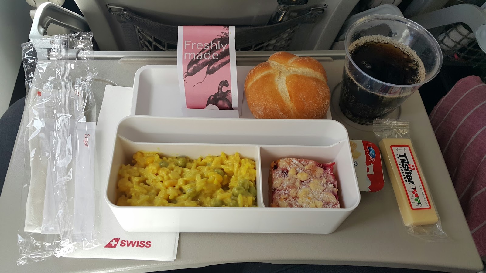 İsviçre ile ülkemiz arasında bir saatlik zaman farkı var. Uçuş ise yaklaşık 3 saat sürdü. Ücretsiz olarak kalem kutusu kadar bir kutuda aperatif yemek verdiler. İçerisinde ana yemek(baharatlı soslu pilav) tatlı, tereyağı ve kaşar peyniri vardı ve yemek sonrası sıcak içecek ikram edildi. Tüm bunlardan sonra ise İsviçre çikolatası ile meşhur olmasından dolayı, herkese küçük bir sütlü çikolata ikramı yaptılar. Bu ikramdan ve hizmetten çok memnun kaldım. Türk Havayolları da fındık dağıtıyor, bu ikramların ülke tanıtımı için önemli olduğu kanısındayım.